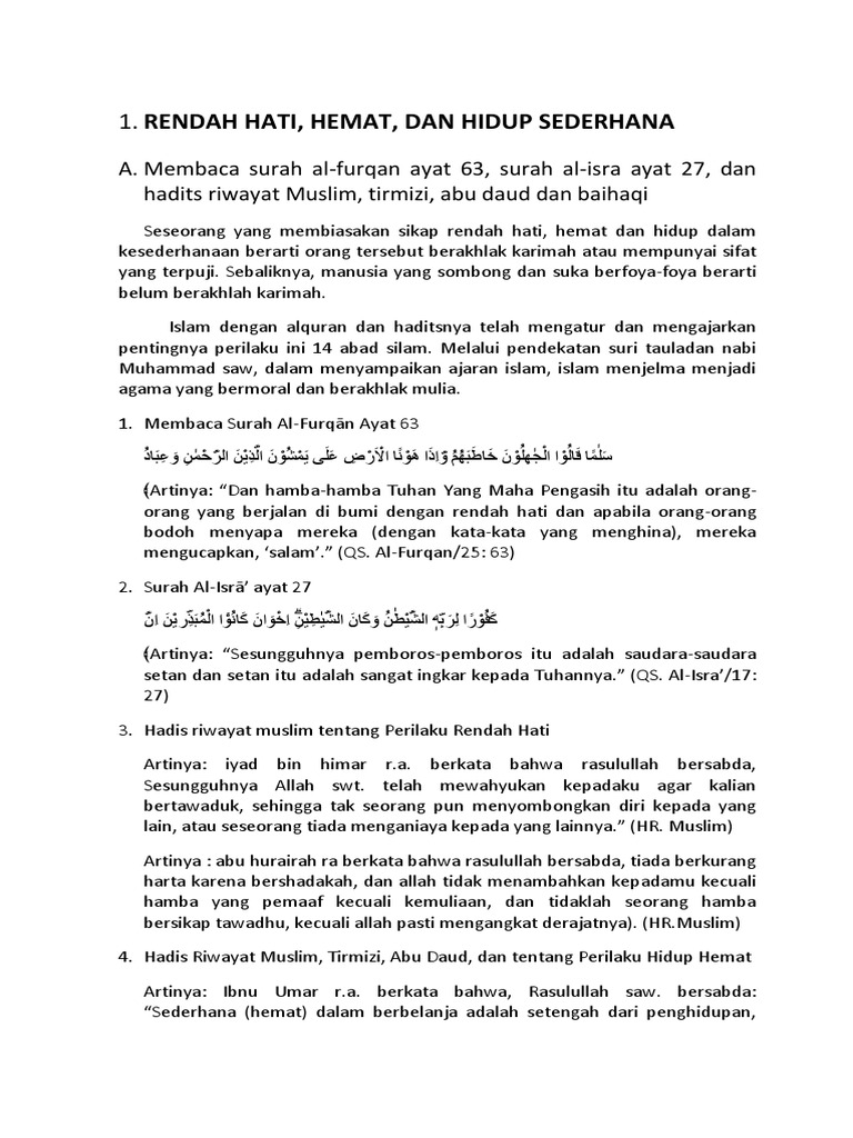 Lihat hadis tentang rendah hati hemat dan hidup sederhana Pada surat al-Furqan 25 ayat 63 Allah mengajarkan agar kita memiliki sifat. Menunjukkan perilaku rendah hati hemat dan hidup sederhana. Rendah hati atau tawadu adalah sikap diri yang tdak merasa lebih dari orang lain. Lihat juga:hati dan hadis tentang rendah hati hemat dan hidup sederhana Tulislah hadis yang menerangkan tentang perilaku hemat dan hidup sederhana.